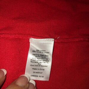 This Talbots cardigan offers a classic and refined style with its open front design and bow detail on the sleeves. The bright red color adds a vibrant touch to any wardrobe. Crafted from a blend of cotton and tencel, it ensures comfort and breathability.
