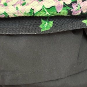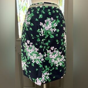 This knee-length, fully lined pencil skirt from Talbots Oprah Magazine Collection features a striking navy base adorned with a vibrant green and lavender floral pattern with a partial zipper back, Its form-fitting silhouette makes it perfect for casual outings or a day at the office, offering both style and comfort.