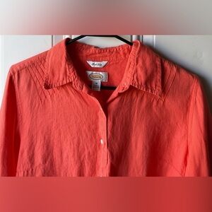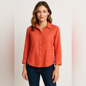 Classic button-down silhouette. Long sleeves with button cuffs. Lightweight, textured fabric. Subtle shaping for a flattering fit. Versatile, wearable color.