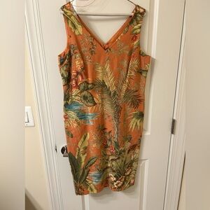Charming dress with floral design. Features earthy tones on a vibrant orange base.
