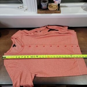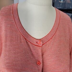 Pretty sparkly button front cardigan. reddish orange stripes. Wear open or closed. • Brand: Talbot's • Size: 2X • Style tags: cardigan, sweater, striped, sparkly, party, preppy, academia. business casual • Condition: pre-owned, great