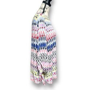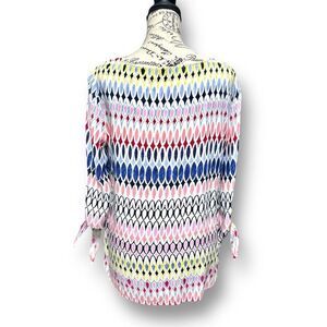 Description: Bright and playful Talbots Petite blouse in a bold geometric print with a keyhole neckline and split tie sleeves. Lightweight and stylish, perfect for work, brunch, or everyday polish.