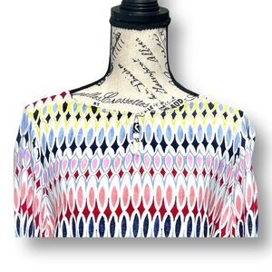 Description: Bright and playful Talbots Petite blouse in a bold geometric print with a keyhole neckline and split tie sleeves. Lightweight and stylish, perfect for work, brunch, or everyday polish.