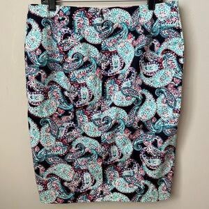 Talbots Paisley Cotton Blend Skirt Blue Knee Length Back Zip Stretch Sz 14
