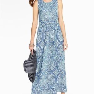 This sleeveless maxi dress by Talbots features a striking blue and green paisley print, perfect for resort wear. The neckline and flowing silhouette offer a breezy, elegant style ideal for casual outings.