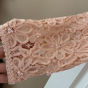 Absolutely stunning set it includes a pleated full length skirt and shirt jacket that buttons up the back. Perfect for your anniversary party or mother of the bride! The color is a pale pink/peach it’s hard to capture it with the lighting. The arms are sheer, beautiful.Measurements are: Armpit to armpit is 20”, top of shoulder to bottom front is 29.” The skirt from waistband to hem is 34” The skirt is sheer, of lace with the underlay being shown. Elastic waist band is 15” laying flat. This is a pre-owned dress, I have not checked to make sure every bead is in place, But it is an excellent condition And sold as is