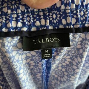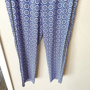 DETAILS: Talbots pants women's medium. Mykonos style in blue mosaic print with jersey stripe along leg, elasticized waist with drawstring. Poly spandex, machine wash.