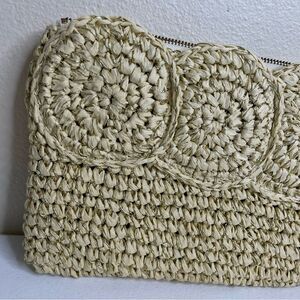 Talbots Paper Straw Gold Metallic Tan Leather Trim Top Zip Clutch Bag Strap