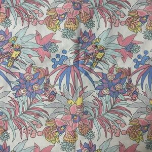 Color Pastel blues, yellows, and pink tropical floral print with parrots.