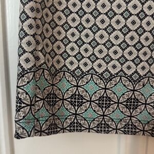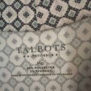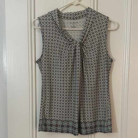 Talbots sleeveless blouse with blue/navy/gray/white all over pattern. Size medium petite. Knit detail at neckline. Additional print detail along bottom hem. Like new!