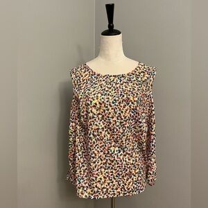 Chiffon-like material. White with multicolor leaf pattern. Gathered neckline. Excellent used condition (EUC)
