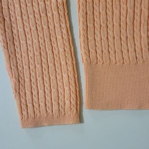 Delicate cable knit stitch adds beautiful dimension to this peach v-neck pullover, crafted from ultra fine cotton. Keep this oh-so soft classic sweater on hand for whatever the day brings. Excellent, new condition.