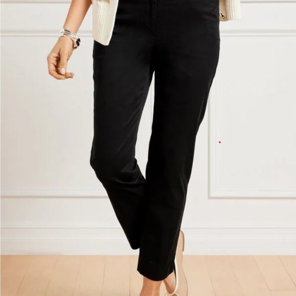 Talbots 'The Perfect Crop' in black. Made from soft breathable twill with ability to be dressed up or dressed down. Front fly with button closure. Crop Length. Hits at waist. Flat front/trouser. Slim leg. 98% Cotton, 2% spandex. Machine wash cold; tumble dry low.