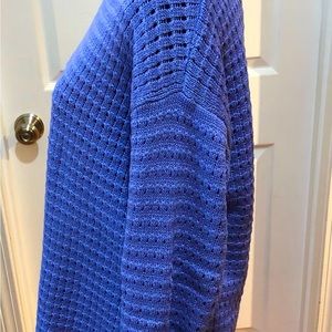 Pointelle long sleeve sweater in a brilliant periwinkle blue hue. Because of the delicate, airy nature of the knit, a cami or tank would be needed underneath.