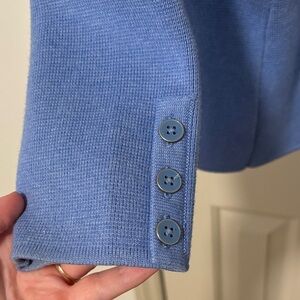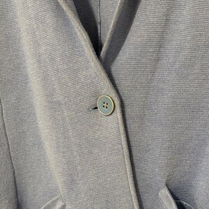 Periwinkle knit blazer with one-button closure. Notched lapels and two front pockets. Lightweight, tailored silhouette for layering. Clean, versatile style for work or casual outfits.