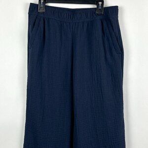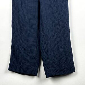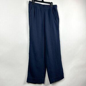 These are a comfortable and chic pair of pants from Talbots, designed with their "Airy Gauze Pull-On Pant" style in a versatile navy blue color. Made from a lightweight and breathable cotton gauze fabric, they are perfect for casual wear or travel. The pants feature a comfortable elastic waistband and a relaxed, wide-leg cut for a flattering and flowy fit. They are designed for convenience with two front pockets and two back pockets, making them both stylish and practical. The "P" on the tag indicates they are a Petite size, perfect for a shorter inseam.