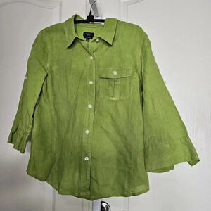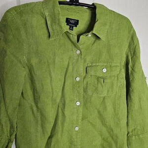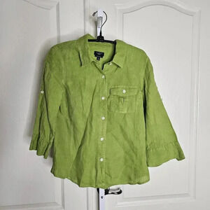Elevate your casual wardrobe with this stylish Talbots petite button-up shirt, crafted from 100% pure Irish linen for a light and breathable feel. Ideal for warm weather, this vibrant green top features a classic collar, button-down front, and a single chest pocket, offering functionality with an eye-catching design. The stylish three-quarter sleeves can be rolled up for a relaxed look. Perfect for pairing with jeans or shorts for a chic everyday outfit. - 100% Irish linen - Size: Small (P) - Color: Vibrant Green - Machine washable for easy care - Ideal for any casual occasion.