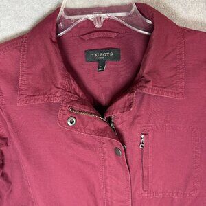 Talbots Petite MP Cotton Twill Safari Utility Jacket Burgundy Drawstring Waist Zip Snap