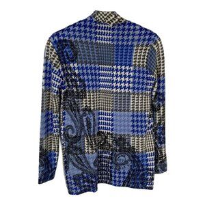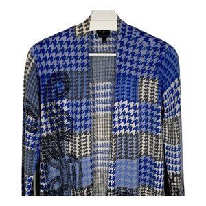 Soft pure merino wool cardigan from Talbots Petites in striking blue plaid patchwork. Lightweight yet warm—ideal for fall layering or office chic. Preowned, excellent condition.
