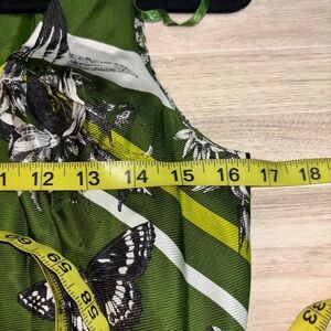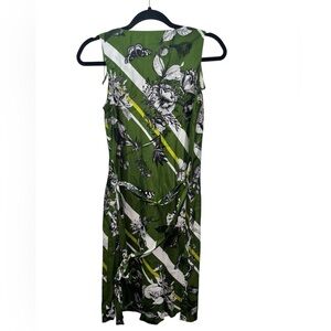 Chic dress with striking green and black patterns. Perfect for any occasion. 100% silk. Removable tie at waist