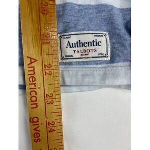 Charming addition to your casual wardrobe: a Talbots Petite striped tunic top. This top features a boat neckline and 3/4 sleeves, providing a comfortable and stylish fit. The eye-catching design incorporates horizontal stripes in shades of orange, pink, white, and blue, creating a playful and versatile look. Details include an "Authentic Talbots" patch near the hem.