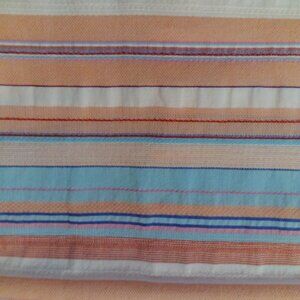 This is a very practical and colorful blouse It is a crisp 100% Cotton Size MP. It is a button down with button sleeve closure. Vivid colors in horizontal stripes.