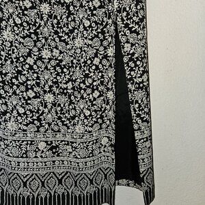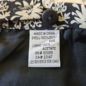 Classic Talbots Petites 100% Silk midi skirt in an elegant black & ivory floral print with contrasting border detail. Features a flattering mid-calf length, a chic side slit, and a smooth acetate lining for comfort and structure.