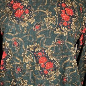 Talbots Petites Blouse Size 4P - Dark Green w/ Red Roses & Gold Scrolling