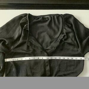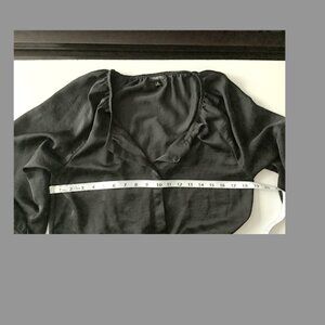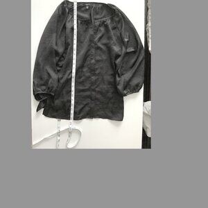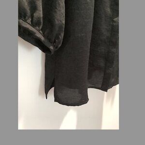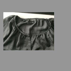 Elevate your wardrobe with the Talbots Petites Classic Black Blouson Top. This 3/4 sleeve tunic-style blouse, in size 12P, is timelessly elegant. Please notice the details at the back, and the side slits.
