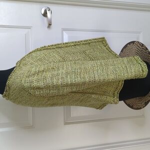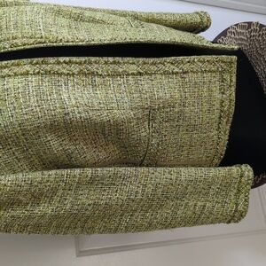 Classic open style Tweed blazer in multi green colors with side piping accent , mock pockets, cuff, neckline, and bottom hem raw knit accent. Fully Lined, excellent quality!