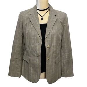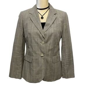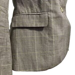 NWOT. Plaid blazer for Women Size 8P. 2 front pockets (still hemmed shut), 1 chest left side pocket, tanish grey, mint green, light padded shoulders, fully lined, 2 slits back bottom hem, long sleeves with buttons for style. Internal blouse and necklace are not included. Pictures are part of description.