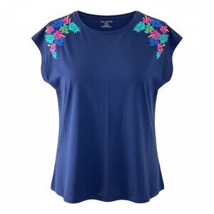Talbots Petites Navy Embroidered Cap Sleeve T-Shirt Lp 100% Cotton, Large Petite