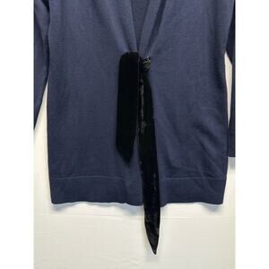 Classic and elegant Talbots Petites cardigan in rich navy blue. Made of soft, pure merino wool with a flattering open front design and a luxe black velvet tie closure at the waist for added sophistication. Perfect for layering over blouses, dresses, or workwear.
