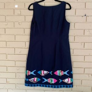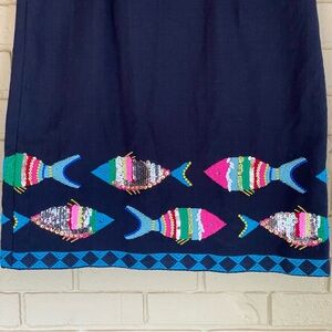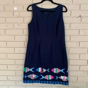 Talbots Petites Navy Sleeveless Sheath Dress Tropical Sequin Fish Resort Wear 8P