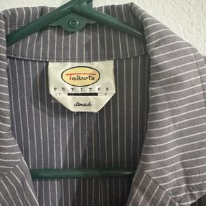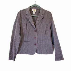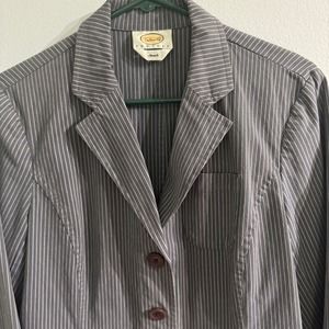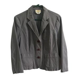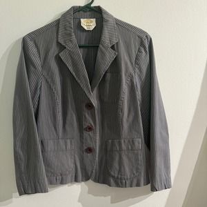 Talbots Grey and White striped 3 button jacket. 3 pockets in front (2 lower, and 1 upper), fabric is 98% cotton and 2% spandex providing some stretch. Excellent condition.