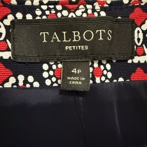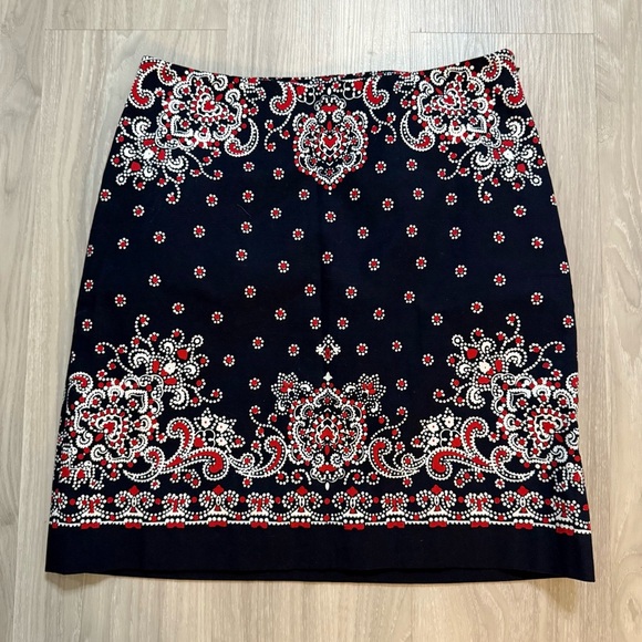This classic Talbots skirt features a striking red, white, and navy paisley border print with small floral dot details throughout. Crafted from a cotton-spandex blend for comfort and ease, and fully lined for a smooth fit. Perfect for pairing with a crisp blouse or a simple tee for year-round style.