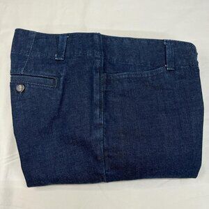 Preloved women's size 4P dark blue denim pants from Talbots Petites, in the signature flare style. Made with a blend of 98% cotton and 2% elastane for a comfortable fit with a bit of stretch. These classic jeans offer a flattering fit and are versatile for a range of casual looks. Measurements: 16" waist, 8" rise, and 28.5" inseam. inv: 0189.
