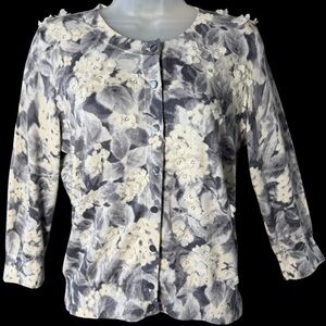 Soft, ethereal, and timeless — this silk-blend cardigan feels like something out of an enchanted forest. Features a romantic floral appliqué design with delicate texture and subtle shimmer tones in gray and ivory. Effortlessly feminine and perfect for layering through the seasons.