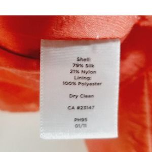 Talbots Petites Silk Blend Rich Coral (Salmon)Crinkle 2 button lightweight long sleeve blazer with 2 lower pockets and 1 upper left. 01/11 79% Silk 21% Nylon 100% Polyester lining. Preowned EUC, see all pictures as part of description. Blazer has been dry cleaned.