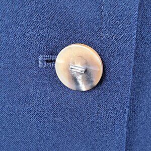 Classic styled navy blue blazer has a 4 button front closure. Notched lapels. Long sleeve with no decorative cuff details. Faux front pockets. Fully lined. Light shoulder pads. Back strap detail. Stretch fabric. Made in Italy. Career wardrobe staple.