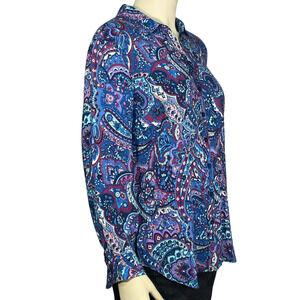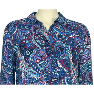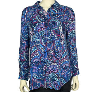 Talbots Petites Sz MP Button Down Blouse Roll Tab Long Sleeve Blue Paisley Rayon