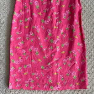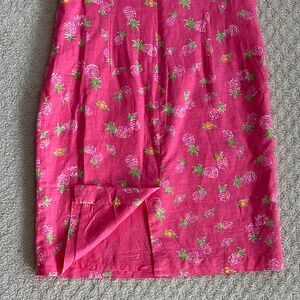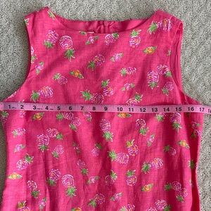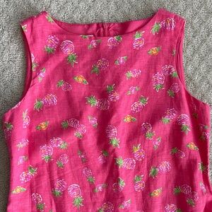 Talbots Petites Vintage Linen/Cotton Blend Shift Dress - Pink Pineapple - Size 6P - Summer. This classic linen blend dress from Talbots features a jewel neckline, sleeveless, soft and lightweight linen/cotton blend fabric, a fun pineapple print, hidden back zip closure, back slit, and fully lined. Excellent pre-owned condition!