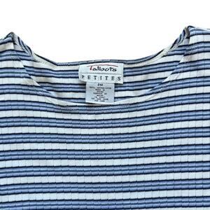 Classic Talbots Petites short-sleeve top in a blue and white horizontal stripe pattern. Made from 100% cotton with a subtle ribbed texture for added stretch and comfort. Features a crew neckline, straight hem, and an easy, relaxed silhouette tailored for a petite frame.
