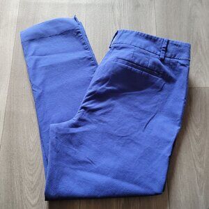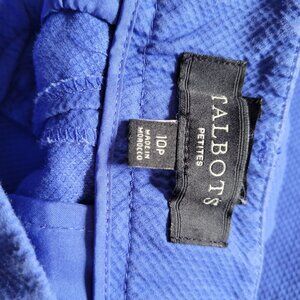 These elegant Talbots Petites pants, size 10P, feature a textured design in a vibrant blue hue. Crafted from a comfortable cotton blend, they offer a sophisticated look suitable for professional settings. The pants present a refined style, ideal for complementing various professional wardrobes.