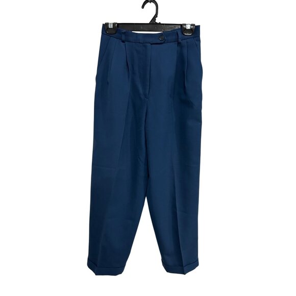 pleated trousers, wool pants, worsted wool, Talbots pants, petite trousers, blue pants, cuffed hem, tapered leg, professional wear, lined trousers, women's pants, button closure, petite size