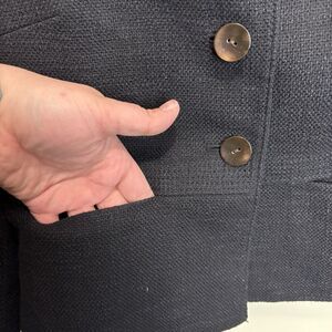 This is a Talbots Petites woven tweed blazer in size 10 for women. The blazer is a short, black suit jacket with a collarless design and 3/4 sleeves. It features a button closure and is made from a cotton blend tweed fabric with a polyester lining. The blazer has a classic fit and is suitable for various occasions like parties, casual outings, formal events, or business settings. It exudes a 60s-inspired, retro, and preppy style with a touch of quiet luxury.