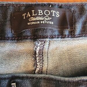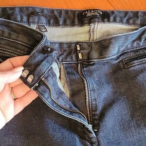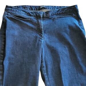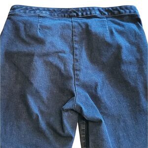 Slim cut denim capris with stretch. Flat front, clean back.. a nice sleek look to dress up or down. Cute 2" slit at the side seam of each hem.
