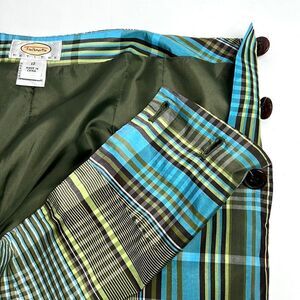 Talbot's Petites Size 10PM, cropped silk pants . Gorgeous green blue and brown plaid pattern. 54% silk, 46% cotton. Pants are fully lined in 100% polyester. Three buttons on each side of pant . Darts at waist front and back. Size 12P, Waist is 16 inches, rise 11,5 inches, Inseam 22 inches, open legs 10,5 inches. Please see all photos with measurements. Gently used in very good condition. B6