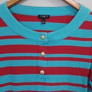 Talbots Pima Cotton Blue/Red Stripes Henley Gold Button Tee