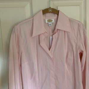 Never worn before with all the original tags still attached. It is a simple collared pink button up shirt with cuffed sleeves.